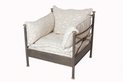 Iron and cushioned Hermes armchair in round iron and hand turned solid brass features. (price for fabric not included).