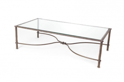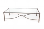 Rectangular iron and glass coffee table with Ligne Metals elegant knot trademark, hammered round iron and hand turned solid brass features.