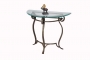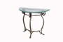 From our popular Hydra range. A hand made half-moon console with lattice shelf and glass top. Ideal for the interior or exterior when supplied with anti-corrosion treatment.