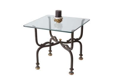 Bout de canapé Lyre en fer forgé carré plein lisse avec pieds en laitons. Issue d'une fabrication artisanale, ce modèle intemporel pourra se trouver dans les univers à la fois urbain, que classique. Assorti avec sa table basse ils créerons un très bel ensemble.