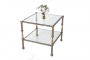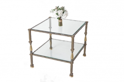 Bout de canapé en fer forgé plein martelé avec laiton et 2 plateaux de verres encastrés. A la fois pratique et raffiné, ce meuble élégant trouvera sa place à côté de votre canapé.