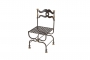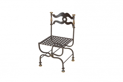 Chaise en fer forgé Lyre, fabriqué en fer carré, avec 2 bobines et 2 pommeaux en laiton ainsi qu'une assise en treillis et un dossier en tôle découpé sera à la fois utilisable en intérieur qu'en extérieur . (attention : le laiton prend une couleur noir au contact de la pluie).