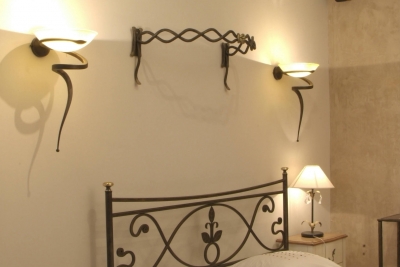 Ciel de lit en fer forgé plein martelé avec nœud central. Idéal à fixer au dessus du lit, vêtu d'une moustiquaire ou d'un voilage, il habillera le mur au dessus du lit et enjolivera l'ambiance de la chambre. D'un style à la fois romantique et classique, il pourra se marier avec le lit Hermès en fer forgé, mais aussi tout les styles de lits.