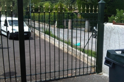 Grille de clôture en fer forgé, non-tolée avec une double traverse en haut.