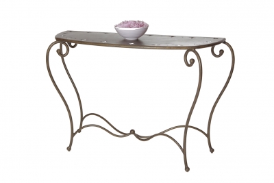 Console demi-lune Cylade en fer forgé plein avec volutes. Ce très beau modèle avec son plateau en tôle perforée de fleurs de Lys sera parfait pour décoré une entrée ou votre terrasse et servir occasionnelement de desserte.
