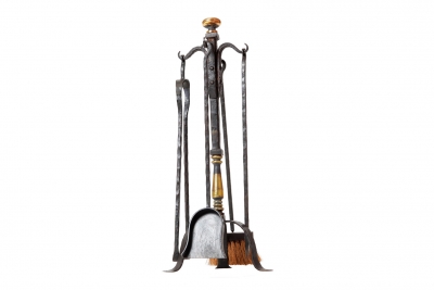 Serviteur sur pied en fer forgé plein martelé, avec laiton. Collection Lyre. Mets à votre disposition 4 articles pour votre cheminée. Une pelle, un ballai, une pointe et une pince. Finition fer naturel ciré.