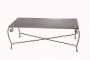 Table basse rectangulaire en fer forgé plein avec volutes. Le plateau est en tôle lisse décoré par des découpes de fleurs de Lys. Elle pourra se situer dans un salon de jardin ou à l'intérieur d'une maison, en toute simplicité.