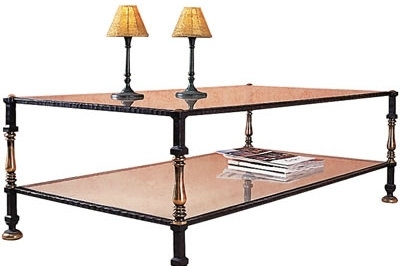 Table basse en fer forgé plein carré martelé avec laitons et 2 plateaux de verre encatsrés. Dans un style assez simple et épuré, ce modèle sera mis en valeur aussi bien dans un univers classique - rustique ou moderne.