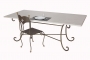 Table de repas rectangulaire en fer forgé plein avec volutes. Le plateau est en pierre, il peut aussi être en mozaique. Cette table se fondra à merveille dans votre jardin. A la fois gracieuse et élégante, elle surprendra vos convives par son originalité et son romantisme.