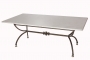 Table de repas Pompea réctangulaire en fer forgé carré plein, avec 4 pieds en laitons. Le pietement formé grace à deux demi-cercle et une traverse droite est à la fois épuré, et simple. Ce pietement à la solidité requise pour supporter une dalle de pierre mozaique. Cette collection est aussi bien moderne que classique.